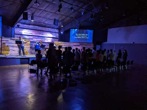 We worship together with the whole church. Students are encouraged to either sit together in the front or with their family.